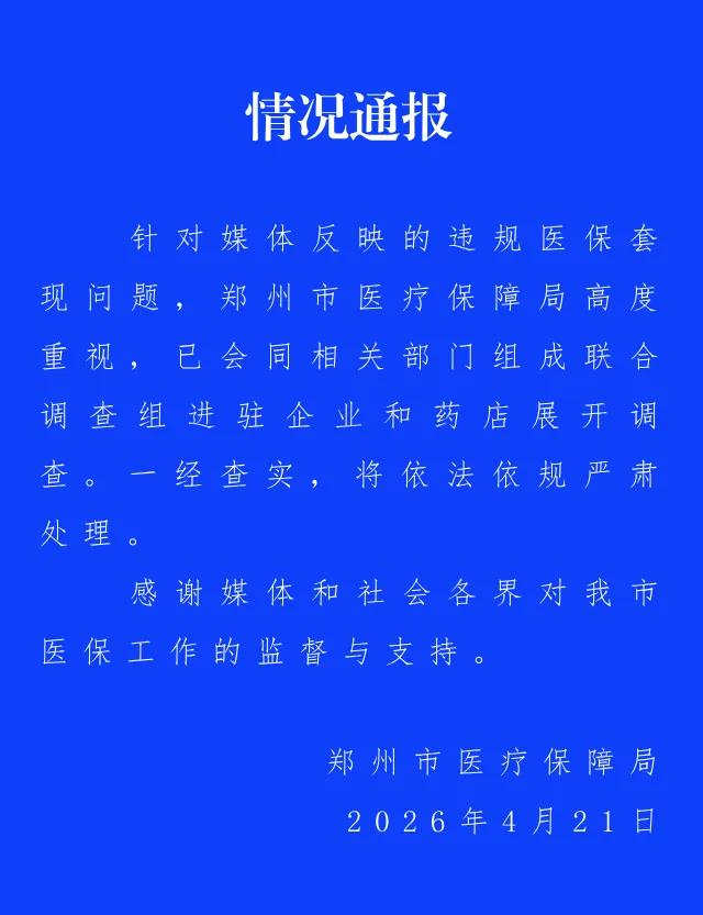 郑州通报药企药店被指医保套现:联合调查组进驻调查